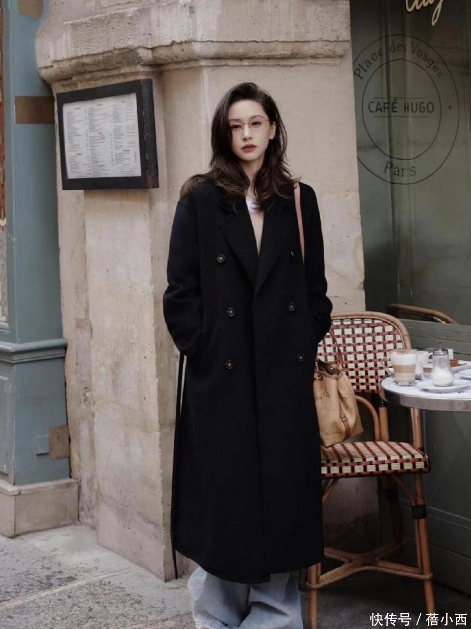 要想穿中长款大衣,那么在松量的选择上一定不要掉以轻心。哪怕你是一米七的个子,大衣松量过多,极有可能让人看着像一米六。腿上的牛仔裤颜色很受欢迎,是浅蓝色,不仅具有显肤白的作用,还十分的减龄。