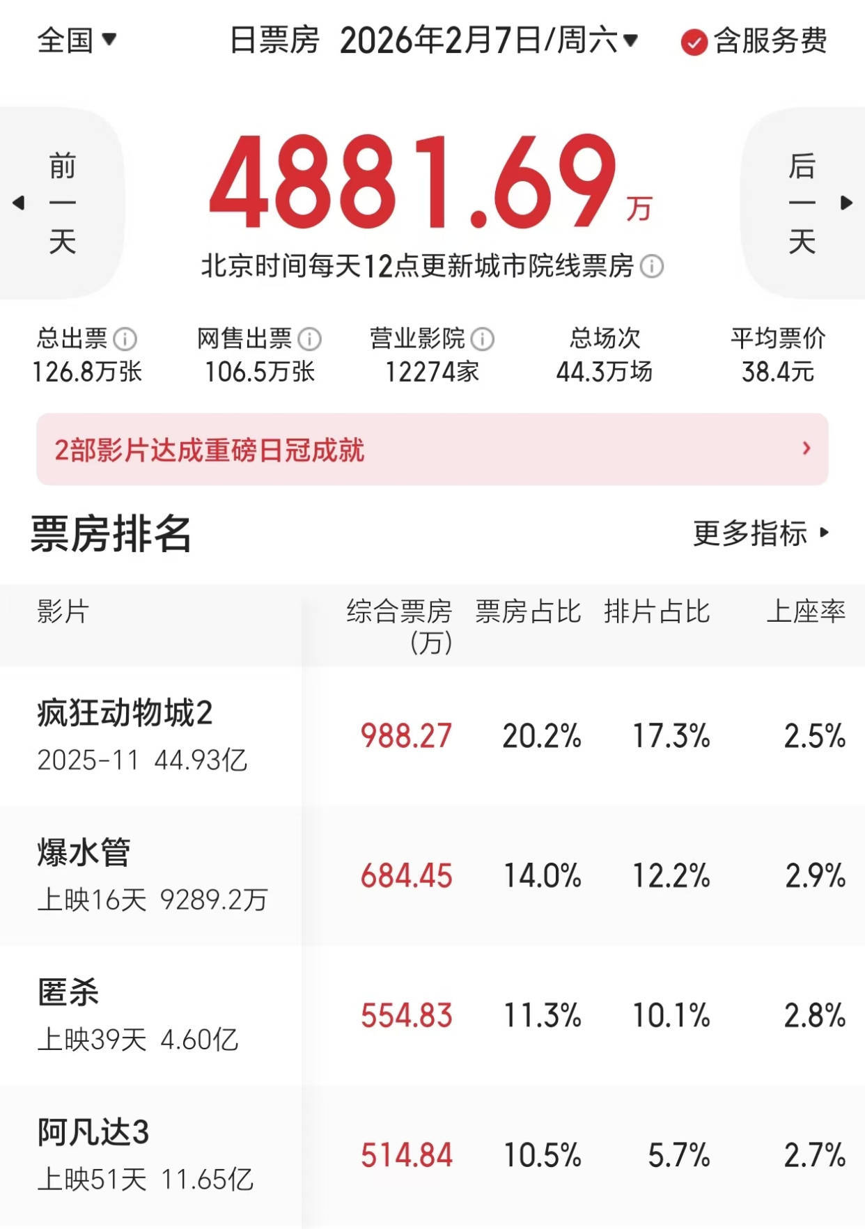 据国内的电影平台所显示,今年2月7日当天,我们中国内地市场大盘4800多万人民币,而成功夺得日冠的却是已经上映了近三个月之久的老片《疯狂动物城2》。另外《匿杀》《阿凡达3》等一众也上映了有一个多月的“老电影”,也都成功挺进了日票房榜前五名。